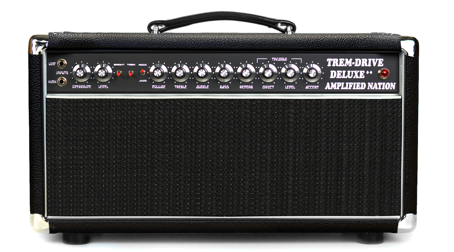 Filled with copious amounts of gain, spring reverb and tremolo, the Trem-Drive Deluxe lets you pay homage to the lesser known Dumble “Overdrive Deluxe” circuit. The Trem-Drive Deluxe delivers all of your favorite classic rock and rock tones, and puts legendary vintage Fender style AB763 reverb and bias tremolo at your fingertips. Through the ‘low’ input, you will find a mellow voicing that stays clean and polite and is reminiscent of a Deluxe Reverb with a full-bodied EQ and vintage familiarity. You can dial in your clean to medium gain tones with the “Level” control and scale the amp with the “Volume”. When plugged into the ‘high’ input you activate additional gain stages which can be dialed in with all three volume controls – setting the gain stageing with the ‘Overdrive’ gain, then the ‘Level’ and eventually the ‘Volume’ (master). These three controls will allow you to dial in unlimited combinations of clean and overdrive, from classic cleans to the gnarliest high-gain, all complete with on-board reverb and bias tremolo. The tremolo is available by switch on the front panel of the amp, or by using the included footswitch.